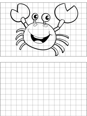 Crab Drawing Printable Coloring Page, free to download and print. A happy crab clicks its claws on a backdrop of lined graph paper to help students learn to draw their own version.