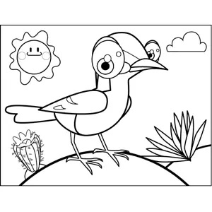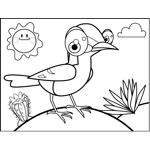 Bird on a Hill Printable Coloring Page, free to download and print. A cute little finch with big eyes sits on a hill near a cactus in this printable bird coloring page.