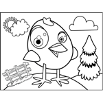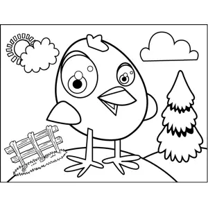 Cocky Bird Printable Coloring Page, free to download and print. A cocky little baby chick stands on a hill in this printable animal coloring page for kids.