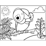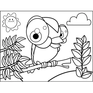 Curious Finch Printable Coloring Page, free to download and print. A curious little finch sits on a branch surrounded by leaves in this printable bird coloring page.