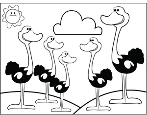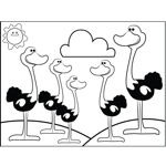 Cute Ostriches Printable Coloring Page, free to download and print. Five cute ostriches stand happily in the sunshine in this printable bird coloring page.