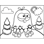 Cute Parakeet Printable Coloring Page, free to download and print. This printable bird coloring page shows a cute, feathery parakeet smiling on a hill.