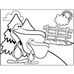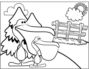 Cute Pelicans Printable Coloring Page, free to download and print. Great for bird lovers, this printable coloring page depicts two cute pelicans standing under the trees.