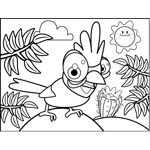 Happy Parakeet Printable Coloring Page, free to download and print. Standing in a setting of tropical leaves and desert cacti, this printable bird coloring page shows a cute, happy parakeet.