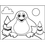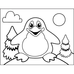 Happy Penguin Printable Coloring Page, free to download and print. This printable bird coloring page features a happy penguin flapping its wings while standing on a forested hill.
