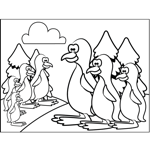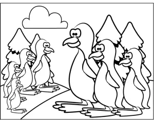 Happy Penguins Printable Coloring Page, free to download and print. An entire flock of happy penguins stands among the trees in this printable bird coloring page.