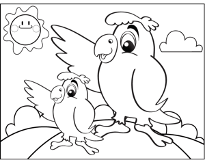 Pointing Parrots Printable Coloring Page, free to download and print. The parrots in this printable bird coloring page point their wings up in a happy salute.