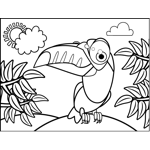 Proud Toucan Printable Coloring Page, free to download and print. A proud toucan shows off his big, beautiful beak in this printable bird coloring page set against a backdrop of leafy ferns.