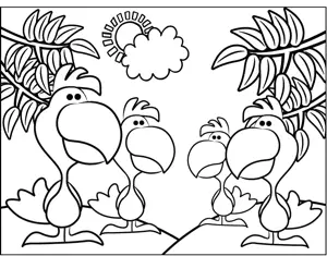 Tropical Birds Printable Coloring Page, free to download and print. Great for bird watchers and pet lovers, this printable coloring page shows three tropical birds with flashy crests.
