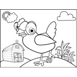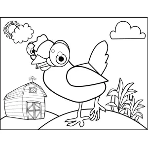 Young Chicken Printable Coloring Page, free to download and print. A young little chick stands on a hill near a barn on a farm in this printable bird coloring page.
