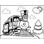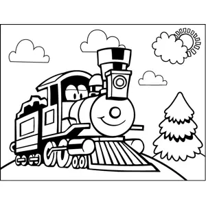 Smiling Train Printable Coloring Page, free to download and print. The train in this printable transportation coloring page smiles as its engine chugs over a hill.