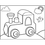 Train Engine Printable Coloring Page, free to download and print. This printable transportation coloring page displays a cute toy train engine on a hill.