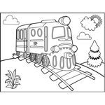 Train and Railroad Track Printable Coloring Page, free to download and print. A train rushes across a railroad track through a forest in this printable transportation coloring page.
