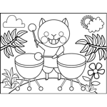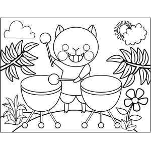 Cat Playing Drums Printable Coloring Page, free to download and print. Great for percussionists and animal lovers, this printable coloring page depicts a cat happily playing the timpani.