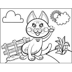 Cat by a Fence Printable Coloring Page, free to download and print. Seated by a fence on a hill, a cat waves its paw and smiles in this printable animal coloring page.