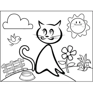 Cat with Food Dish Printable Coloring Page, free to download and print. Great for art classes and fun activities, this printable cat coloring page shows a cute kitty and her food dish in a flowery field.