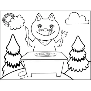 Hungry Cat Eating Steak Printable Coloring Page, free to download and print. Licking his lips and holding his utensils, the cat in this printable animal coloring page is preparing to eat a delicious steak dinner.