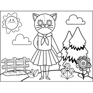 Kitty in a Dress Printable Coloring Page, free to download and print. There's a pretty kitty in a dress standing in a field near a fence in this printable animal coloring page.