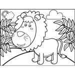 Lion in Jungle Printable Coloring Page, free to download and print. A cute lion with a big mane stands on a hill surrounded by jungle leaves in this printable cat coloring page.