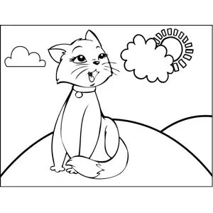 Pretty Cat Meowing Printable Coloring Page, free to download and print. Color in this printable coloring page of a pretty cat looking at the sun and meowing or singing to herself.