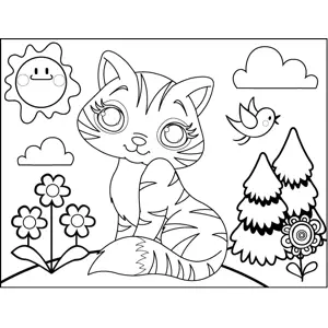Pretty Striped Cat Printable Coloring Page, free to download and print. A pretty, striped kitten poses adorably in a field full of trees and flowers in this printable cat coloring page.