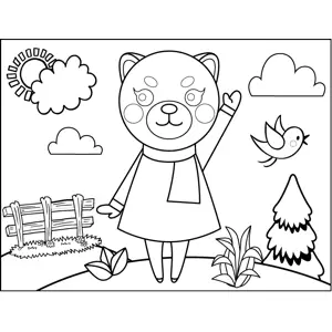 Waving Cat in Scarf Printable Coloring Page, free to download and print. Set against a background field with plants and a fence, this printable animal coloring page depicts a pretty cat wearing a scarf and waving.