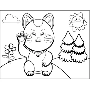 Waving Cat with Bell Collar Printable Coloring Page, free to download and print. A cute, happy cat waves its paw as it sits on a hill in a forest in this printable animal coloring page for kids.