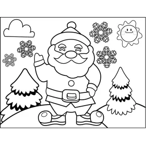 Happy Santa Claus Printable Coloring Page, free to download and print. Santa Claus stands, smiling and pointing at the snowflakes in the sky in this printable Christmas coloring page.