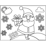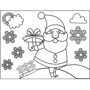 Santa Holding Gift Printable Coloring Page, free to download and print. Santa holds a Christmas present behind his back in a snowy field in this printable coloring page for winter holidays.