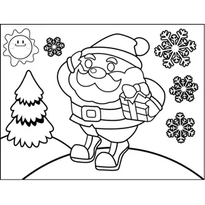 Santa on Hill Printable Coloring Page, free to download and print. Great for Christmas art activities, this printable holiday coloring page shows Santa Claus saluting on a hill in the snow, holding a present under his arm.