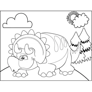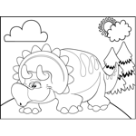 Drowsy Triceratops Printable Coloring Page, free to download and print. The dinosaur in this printable prehistoric coloring page is a happy triceratops lumbering through the hills.