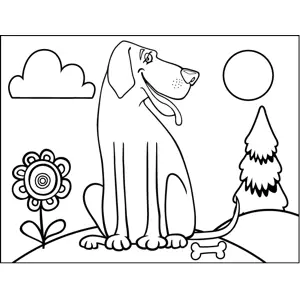 Coy Dog Printable Coloring Page, free to download and print. Standing in a field of flowers and trees with a bone at its feet, the dog in this printable animal coloring page turns its head away and gives a coy smile.