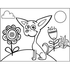 Cute Chihuahua Printable Coloring Page, free to download and print. A cute Chihuahua sits among beautiful flowers in this printable dog coloring page for kids.