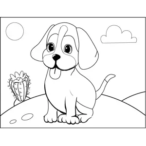 Cute Panting Puppy Printable Coloring Page, free to download and print. A cactus flower blooms behind a panting puppy dog in this printable animal coloring page for kids.