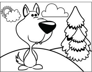 Cute Wolf Printable Coloring Page, free to download and print. Smiling with fangs and perked ears, the wolf stands on a hill in this printable animal coloring page.