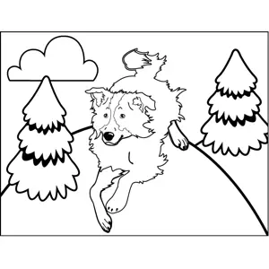 Dog Playing Printable Coloring Page, free to download and print. Rendered in a very realistic style, the dog in this printable animal coloring page is playing on a hill full of trees.
