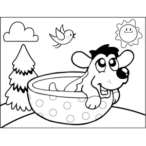 Dog in Spotted Bowl Printable Coloring Page, free to download and print. There is a spotted bowl on a hill containing a barking puppy in this printable puppy coloring page.