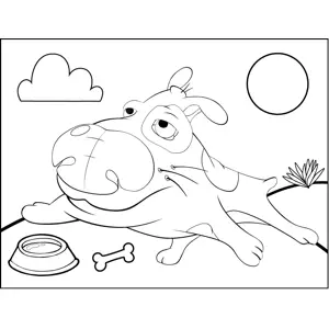 Sprawling Dog with Dish Printable Coloring Page, free to download and print. An unhappy spotted dog with a huge, bulbous nose sprawls discontentedly by its food dish and bone in this printable animal coloring page.