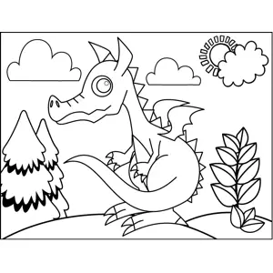 Nervous Dragon Printable Coloring Page, free to download and print. This printable creature coloring page depicts a nervous dragon with fins and wings standing in a forest.