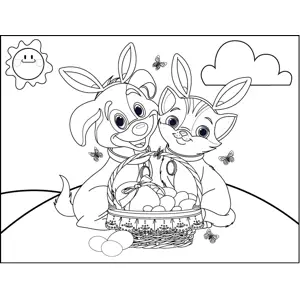 Dog Cat Easter Basket Bunny Ears Printable Coloring Page, free to download and print. Pet owners will love this printable animal coloring page featuring a cute kitten and puppy wearing rabbit ears and sitting near an Easter basket full of eggs.