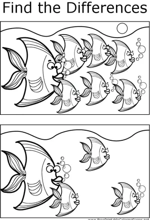 FTD Angelfish Printable Coloring Page, free to download and print. A number of differences can be found between the two pictures of a school of angelfish swimming in the ocean.