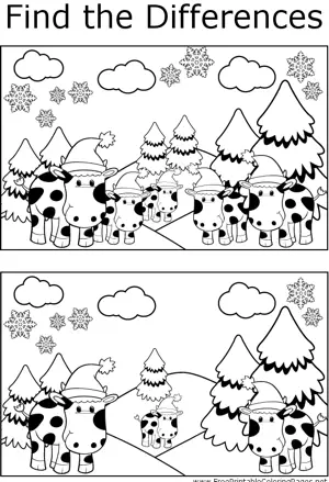 FTD Christmas Cows Printable Coloring Page, free to download and print. Teachers can use this printable coloring page to help students spot the differences between two pictures of Christmas cows wearing Santa hats.