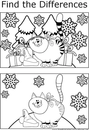 FTD Christmas Kitty Printable Coloring Page, free to download and print. The two scenes of a Christmas kitty with a present depicted in this printable coloring page have several key differences that can be found.