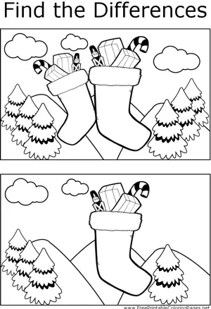 FTD Christmas Stockings Printable Coloring Page, free to download and print. Great for quiet activities and art, this printable coloring page shows several differences between the two pictures of Christmas stockings stuffed with toys.