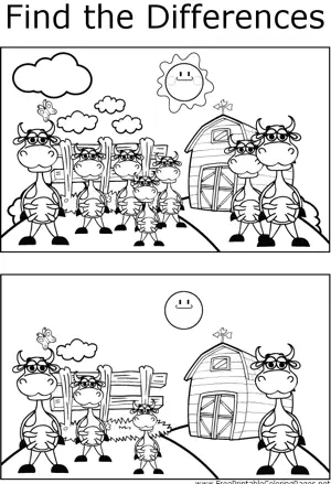 FTD Cows Printable Coloring Page, free to download and print. Find the differences between the two pictures in this printable coloring page featuring a farm full of happy, standing cows.