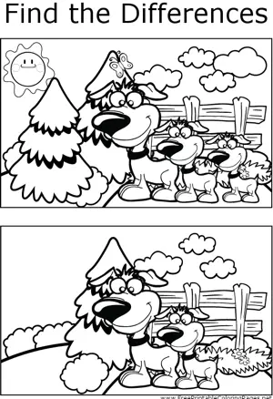 FTD Dogs Printable Coloring Page, free to download and print. Great for quiet activities and art, this printable coloring page shows several differences between the two pictures of happy, smiling dogs in a field.