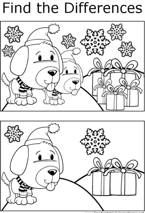 FTD Dogs and Snowflakes Printable Coloring Page, free to download and print. If you look carefully, you can find differences between the two pictures of panting dogs, snowflakes and presents in this printable coloring page for kids.