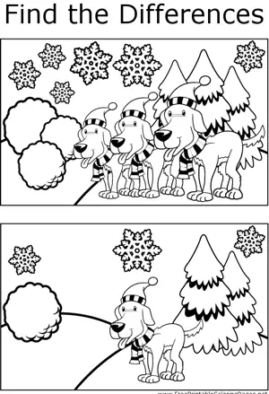 FTD Dogs in Snow Printable Coloring Page, free to download and print. The two snowy scenes of panting dogs depicted in this printable coloring page have several key differences that can be found.