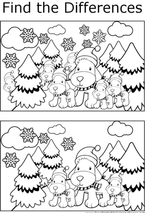 FTD Dogs in Trees Printable Coloring Page, free to download and print. Hone your observation skills by finding the differences between the two pictures of dogs in winter gear under the trees in this printable coloring page.