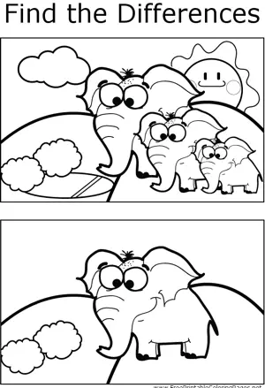 FTD Elephants Printable Coloring Page, free to download and print. Find the differences between the two pictures in this printable coloring page featuring happy elephants standing by a pond.